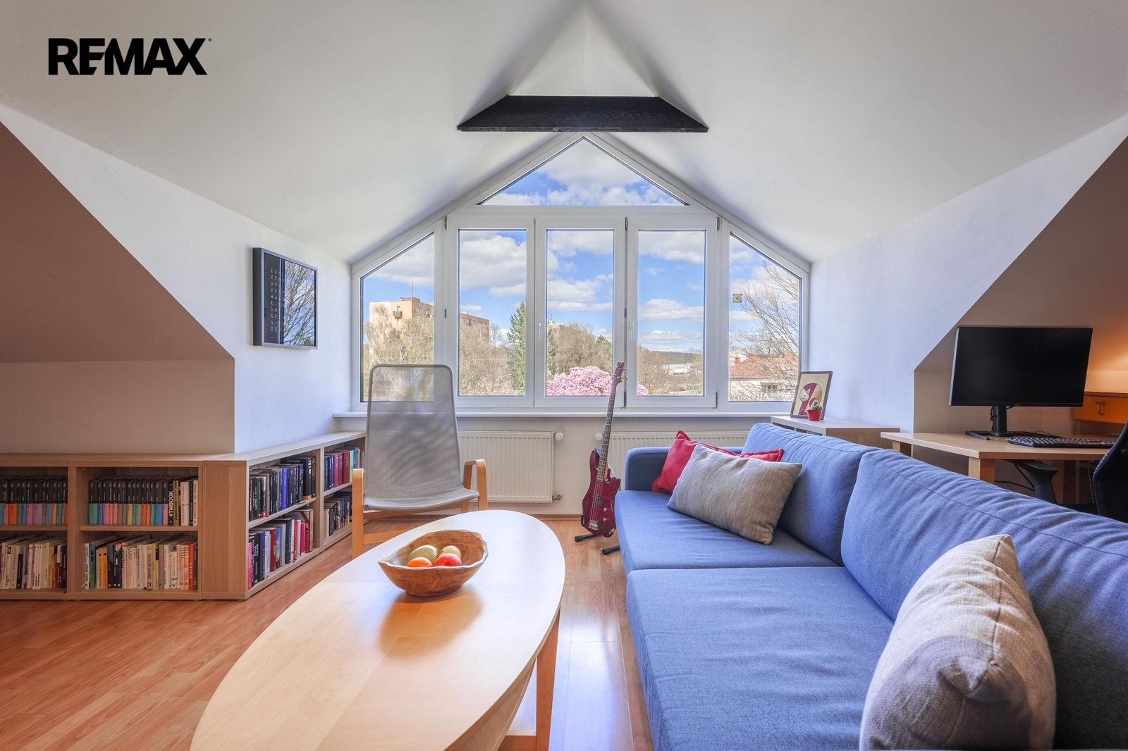 Byt působí velmi světlým a útulným dojmem. Díky orientaci na více světových stran nabízí příjemné světelné podmínky během celého dne. V obývacím pokoji si budete užívat vzdušný výhled velkým oknem do zeleně parku před domem.