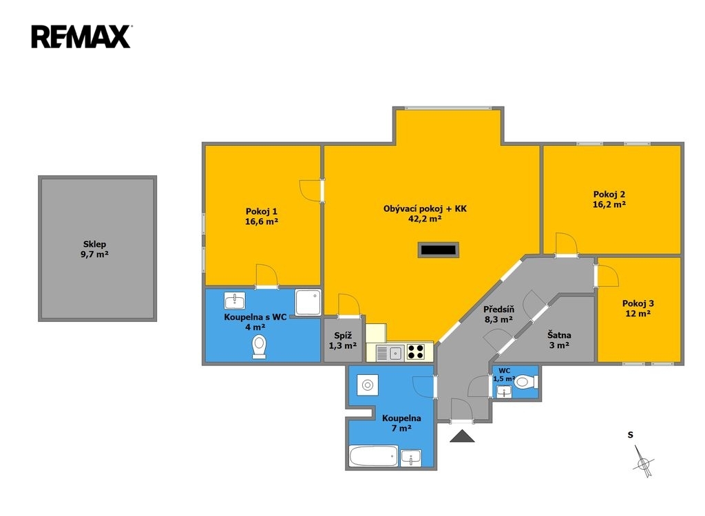 Dispozice dále zahrnuje vstupní chodbu s komorou (šatnou), tři neprůchozí pokoje, dvě koupelny, samostatné WC a spíž přímo v kuchyni. Velkým benefitem je tedy nadstandardní množství úložného prostoru.