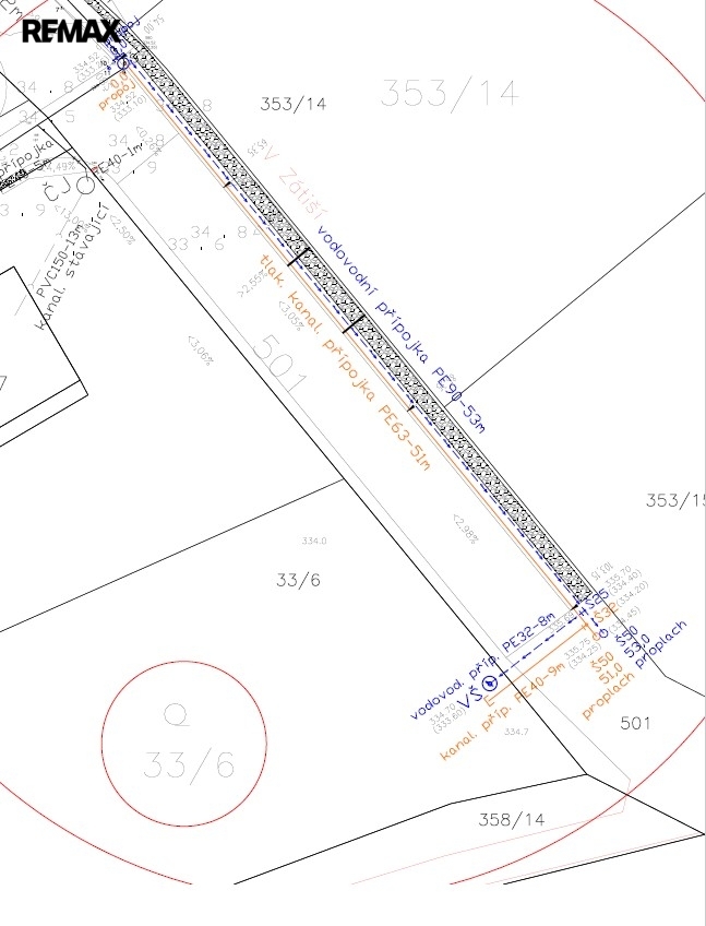 V rámci inženýrských sítí je již řešeno připojení elektřiny – byla podána žádost u ČEZ a počítá se s připojením včetně vybudování pilíře na hranici pozemku do 15.6.2027. Voda a kanalizace jsou aktuálně v řešení – existuje situační návrh napojení a probíhá komunikace s obcí ohledně finálního schválení. Tyto přípojky si vybuduje nový majitel na vlastní náklady.